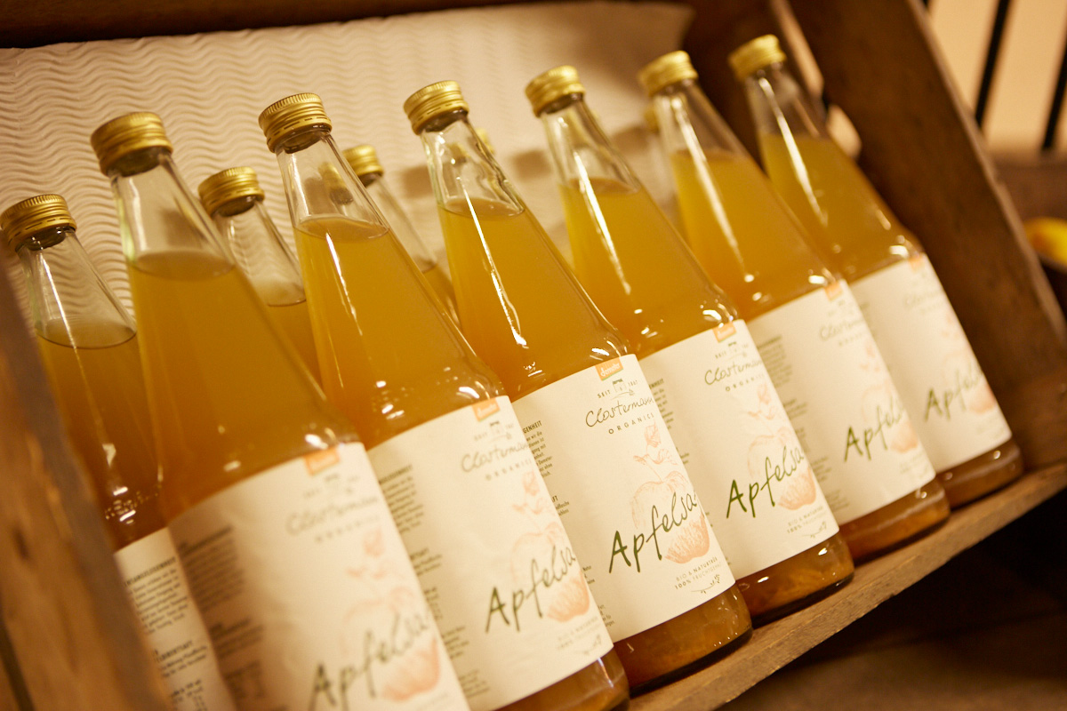Pure natural juices, Rhenish apple spread without added sugar, honey from our farm bees, sparkling apple wine in prosecco style … and of course our award-winning non-alcoholic “Appléritif” fruit prosecco – all produced using organic apples from our very own orchards.